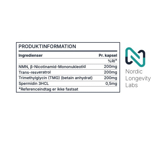 Hver kapsel indeholder fire nøgleingredienser, 200 mg NMN, 200 mg resveratrol, 200 mg TMG og 0,5 mg spermidin som virker i synergi.